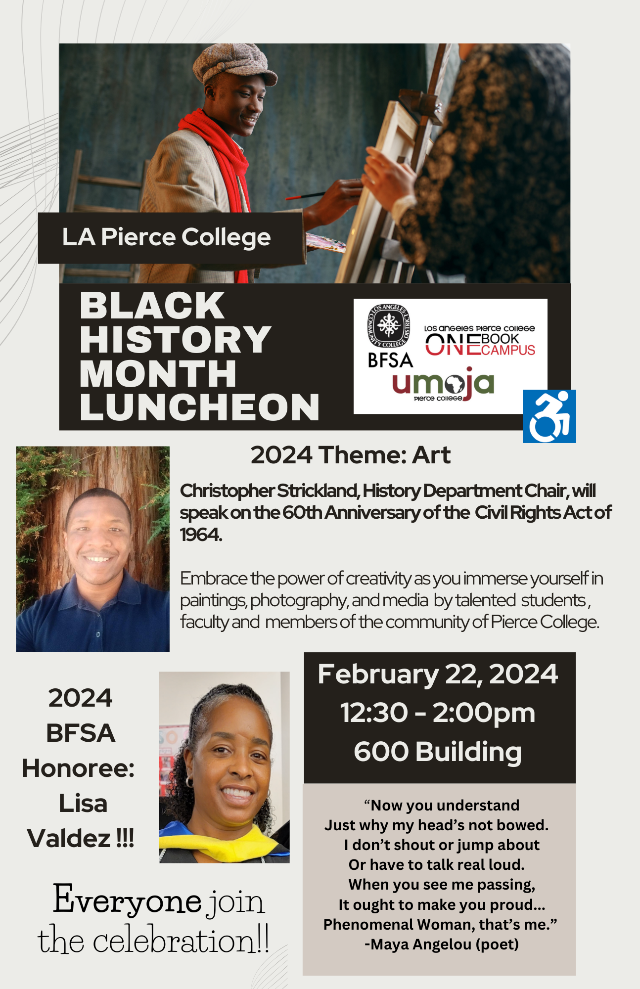 This year is the 4th annual Black History Month Luncheon. The theme this year is Labor, an honoree is chosen, and 5 Umoja students are honored in celebration of Black educational excellence, history and culture. All are invited! Click the image to learn more on the theme and how it is decided each year.
